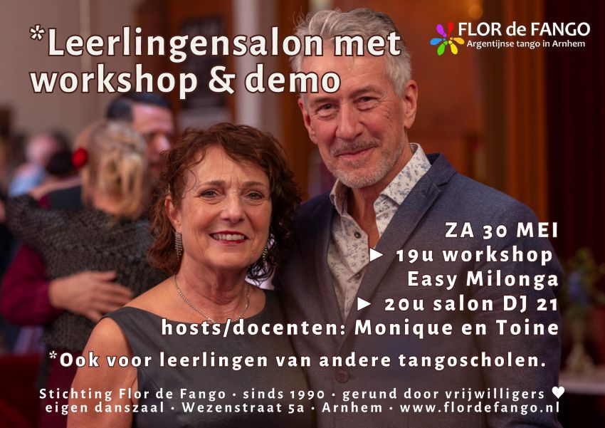 Docenten Toine & Monique hosten op zaterdag 30 mei de eerste leerlingensalon van dit jaar. Met workshop om 19u en om 20u start de salon. Voor een prikkie doe je mee aan de workshop én de salon: €10. Alleen de salon is €6.